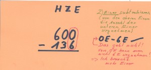 Bei der Notation der Aufgabe im Heft sollten neben der Form für die schriftliche Subtraktion, zumindest anfänglich, die einzelnen Minusaufgaben der Einer, Zehner und Hunderter, wie auf der gelben Karte dargestellt, parallel mit aufgeschrieben werden.